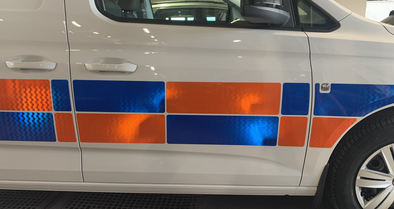 Reflexdekor med Battenburgmönster – för utryckningsfordon, arbetsfordon och firmabilar.